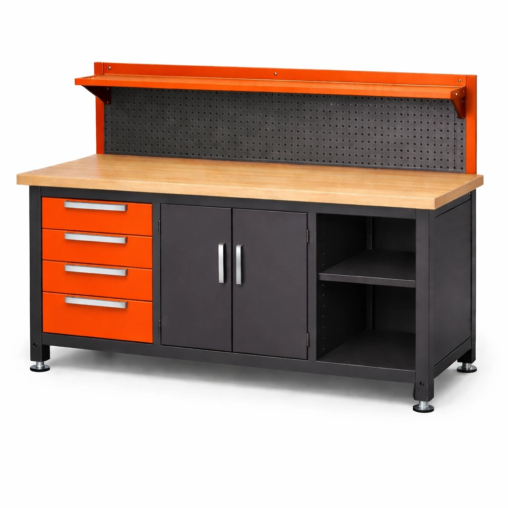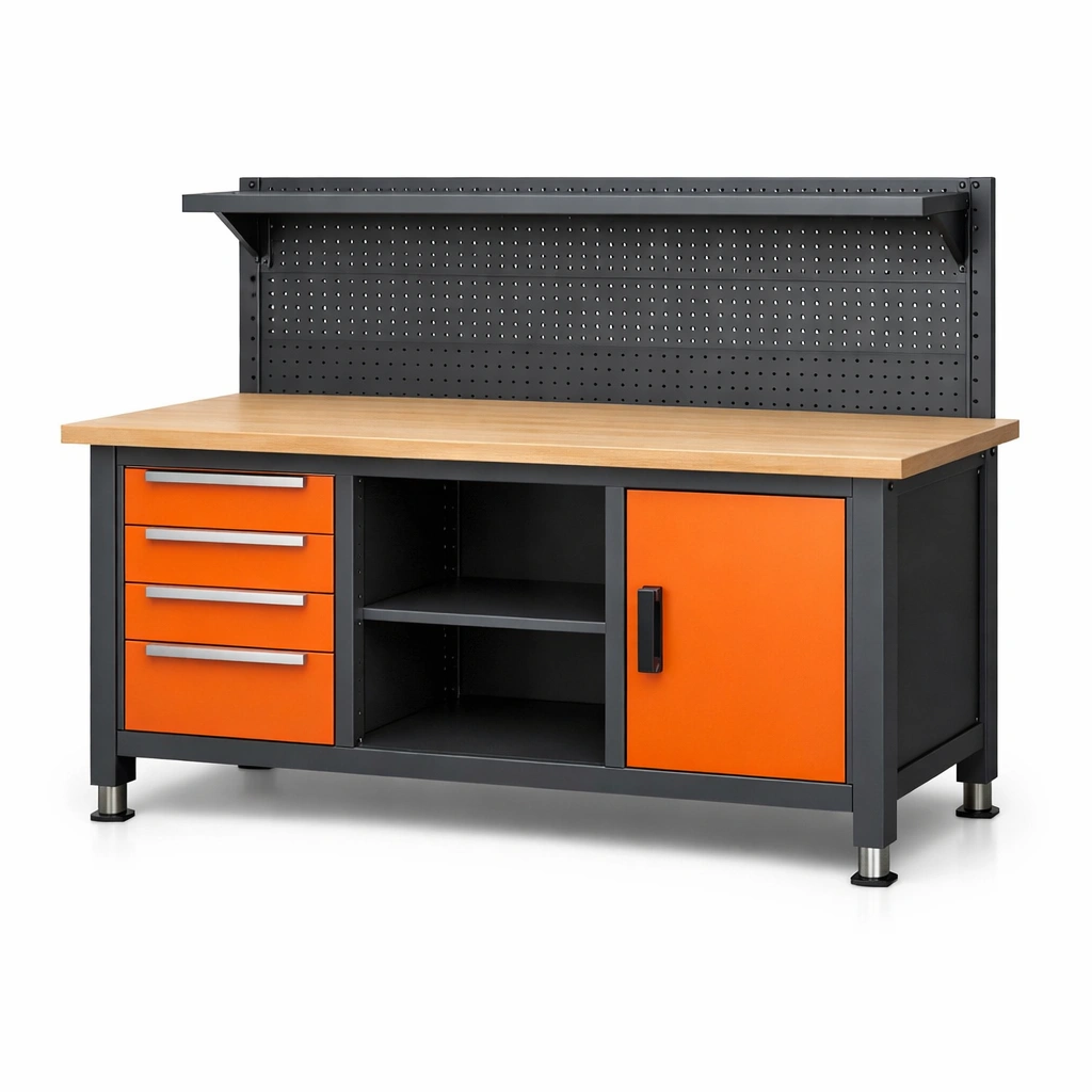 Banco da lavoro in metallo con piano in legno di faggio e armadietto arancione