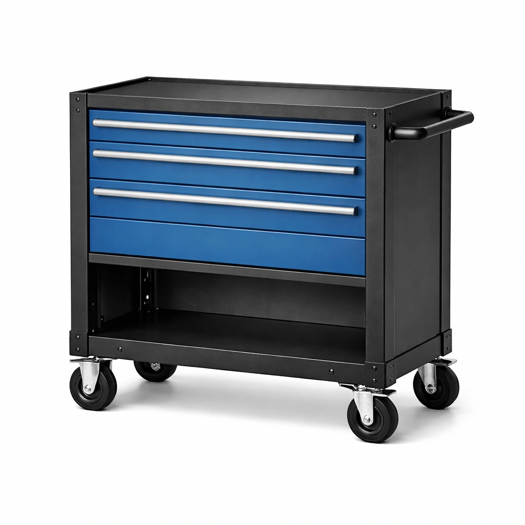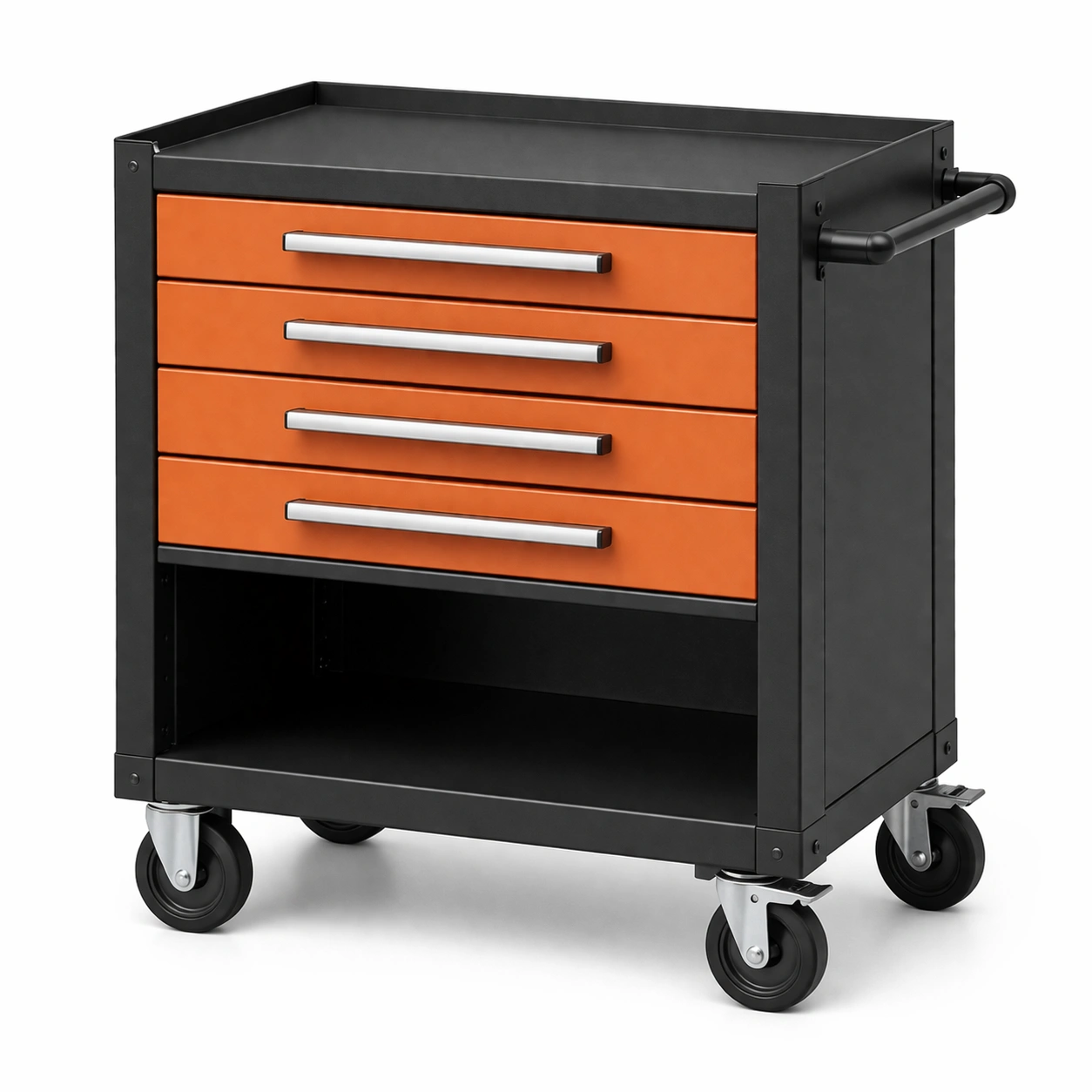 Carrello portautensili in metallo con cassetti e ripiano aperto arancione nero