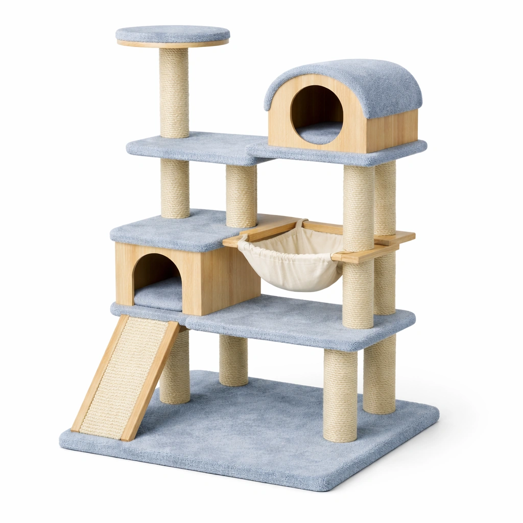 Componenti Inclusi: Albero con piattaforme, amaca in tessuto, tunnel, pali rivestiti in sisal