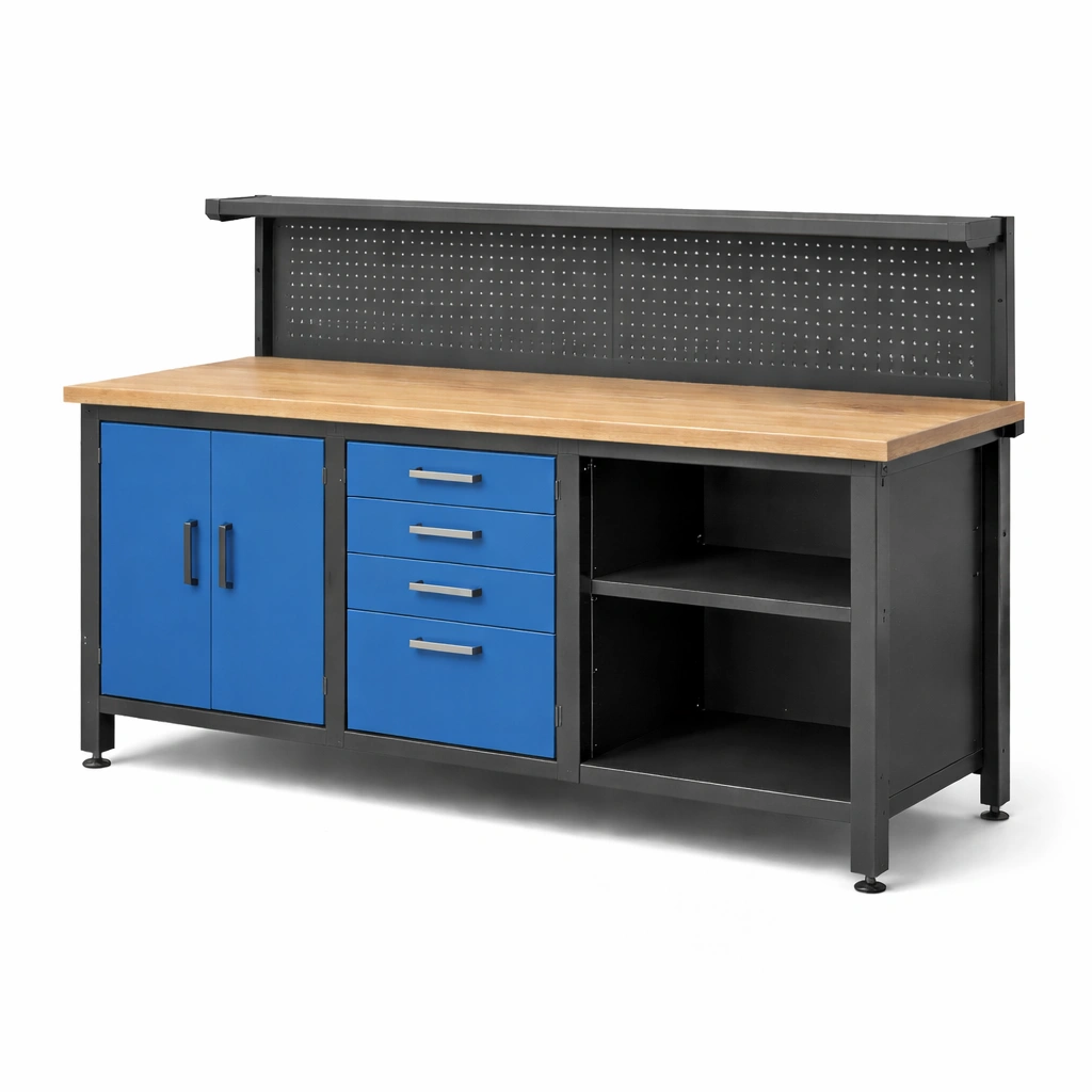 Banco da lavoro con struttura in acciaio e piano in legno di quercia. Include cassetti e armadietti per stoccaggio. Capacità di carico massima: 300kg.