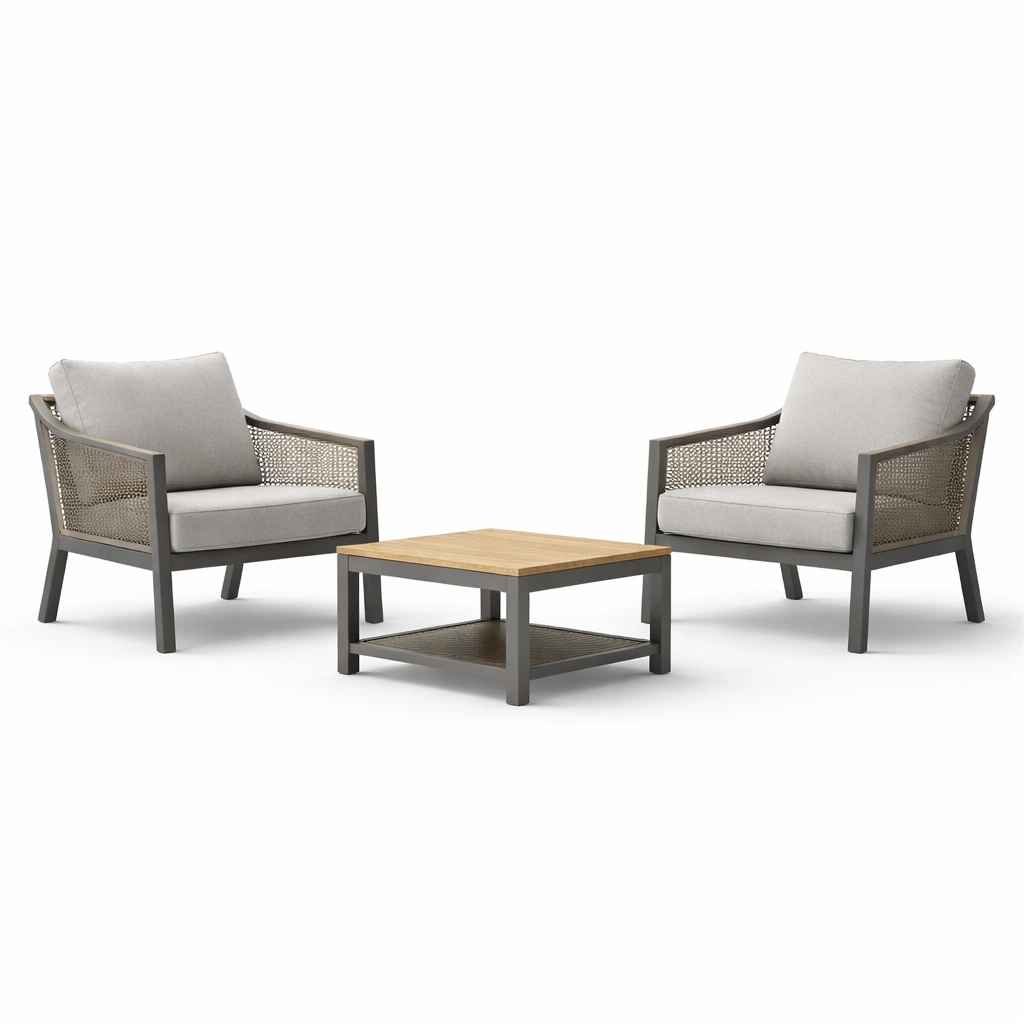 Set composto da due poltrone e un tavolino per uso esterno.