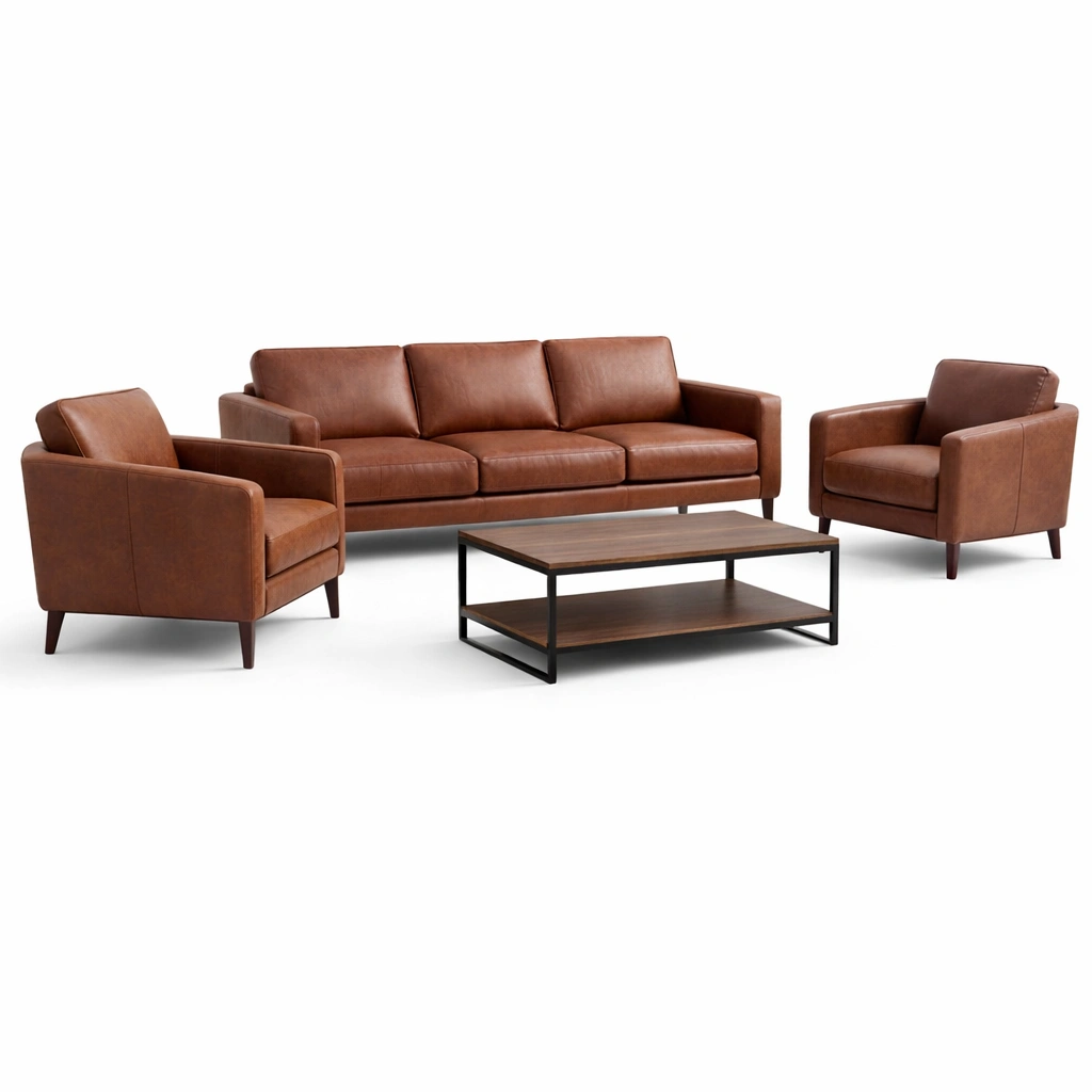 Prodotto lista: Divano a tre posti, due poltrone singole, tavolino